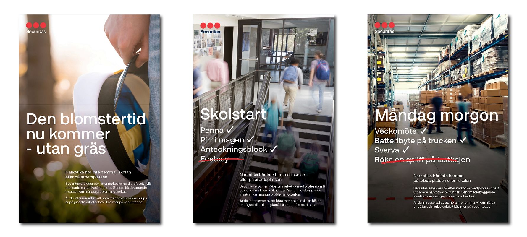 För att belysa sökhundsverksamheten kommer Securitas att marknadsföra tjänsterna både genom digitala annonser och helsidor i kvällstidningar under sommar och höst. Annonserna pekar på att varken skolgång eller arbete hör ihop med narkotikaanvändning. Under juni publicerades en helsidesannons som visade en studentmössa med texten ”Den blomstertid nu kommer – utan gräs”.